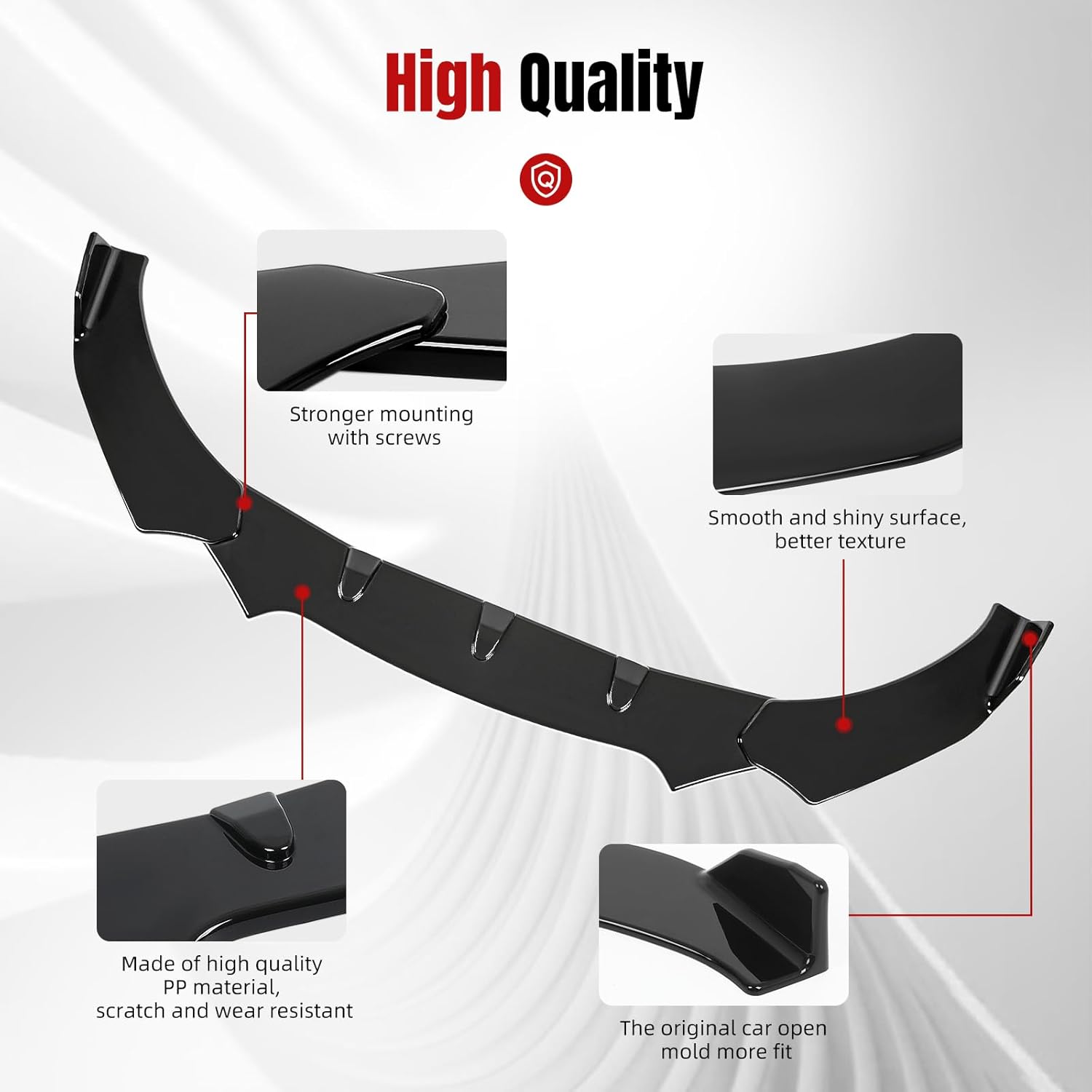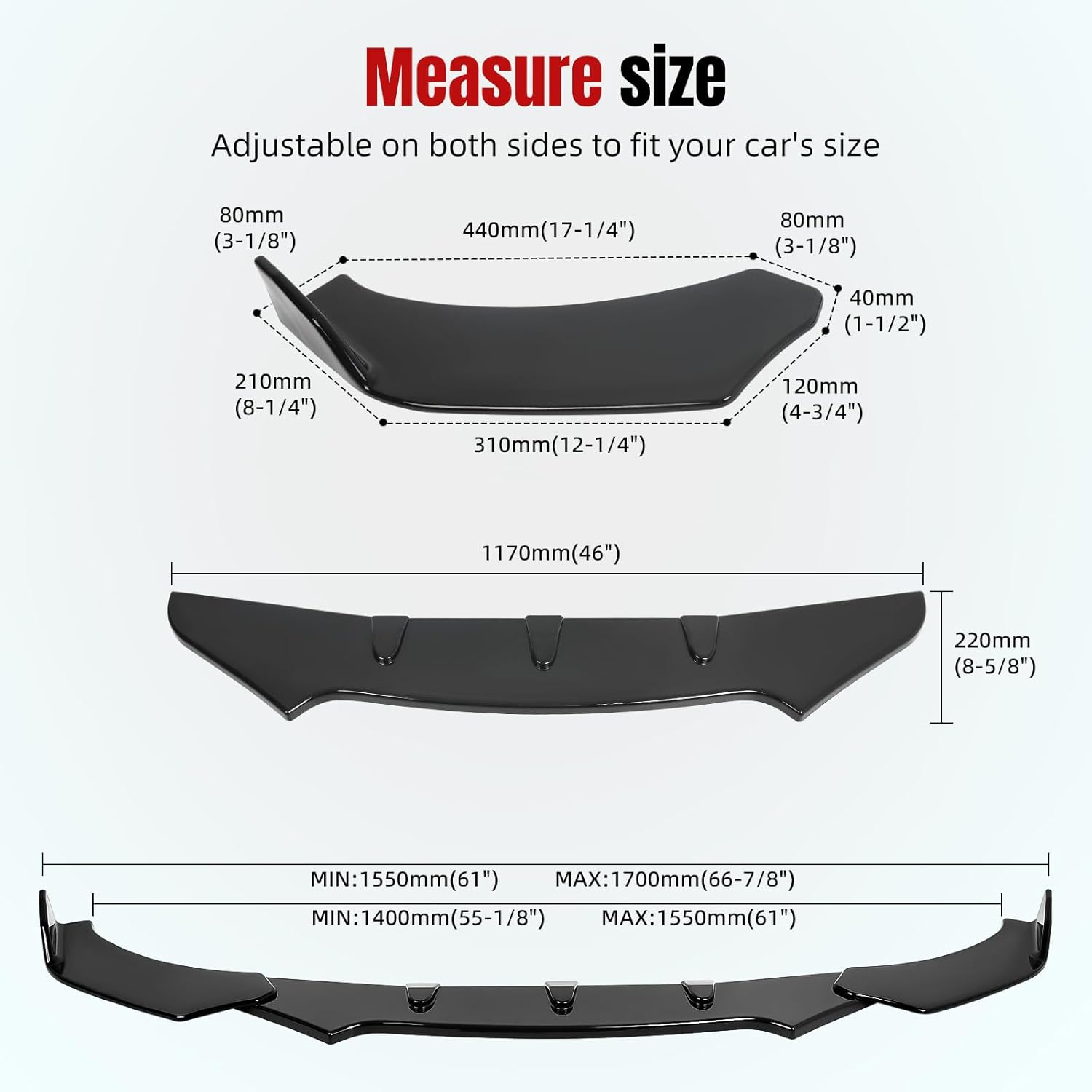 ★Specifications:Type:Front Bumper Lip Body Kit SpoilerFront Lip Color: Gloss blackAuto Part Position:FrontFront Lip Material: PPFitment Type:Universal FitProfessional Installation Required★Fitment:Universal front lip for car.(please check the size before purchasing)Compatible With Honda Civic/Accord /CR-V /...Compatible With Toyota Camry / corolla / altis / 86 /...Compatible With Dodge Challenger / Charger / Avenger / dart / durango gt /...Compatible With Ford Mustang / Fusion / Focus / ...Compatible With Chevrolet Chevy Malibu / impala / equinox / camaro / corvette / Cobalt / SS /...Compatible With V-W golf R / golf GTI / arteon / jetta /tiguan / passat /Accent / ...Compatible With Hyundai Sonata / Elantra / Kona / Veloster R-Spec / ...Compatible With BMW 320i /328i / 330i / 430i / 435i / 528i / 535i / 540i / 550i f10 / 750li / x5 / Mini Cooper /...Compatible With Infiniti G35 / G37 / Q50 / ...Compatible With WRX limited / legacy / Impreza /...Compatible With Kia K5 / Optima /Soul / Sorento / Forte / sportage / Rio / protege5 /...Compatible With Lexus LS 460 f sport / is250 / lexus rc350 /...Compatible With Mazda3 /Mazda6 / Protege5 / Miata / ....Compatible With Mitsubishi Lancer / mirage / Eclipse / outlander / galant es / ASX / ...Compatible With Mercedes-Benz C43 AMG / C300 / E350 / E450 /...Compatible With Nissan Altima / Sentra / Versa / Micra /Maxima / 350z / ...Compatible With Audi A3 / A4 / Q5 /...Compatible With Acura TL / mdx aspec / tsx / tlx /...Compatible With Cadillac CT4 / CT5 /...Compatible With Scion tCCompatible With Chrysler 200 / 300 /Compatible With Tesla 3★Package included:3Pcs Front Bumper Lip SpoilerMounting Accessories