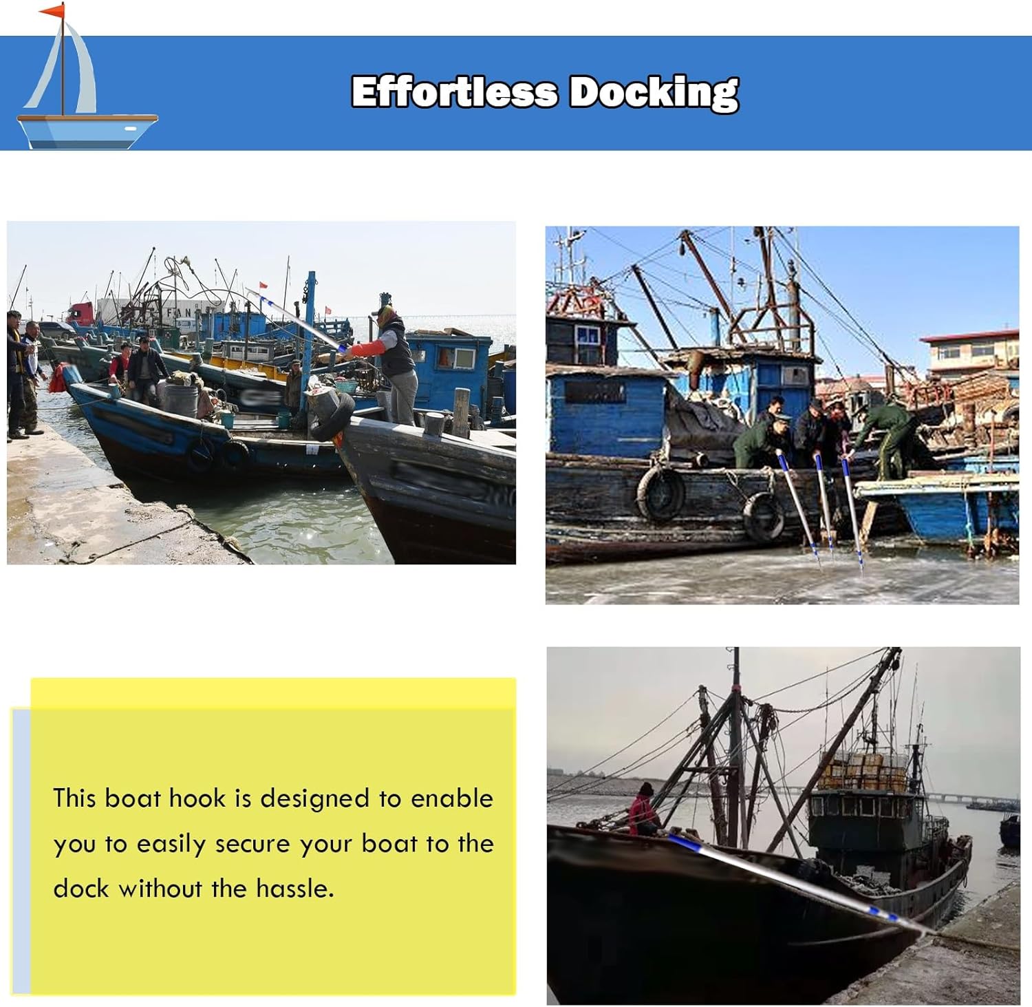 - Q: What is the length when the pole is fully extended?- A: The boat hooks with pole are 2m (6' 7inch), 3m (9' 9inch), 4m (13ft), 5m (16' 5inch), 6m (19' 8inch)- Q: Does the docking pole require maintenance?- A: Rinse to pole and the pole in fresh water after use in salt water!- Q: Can I use this telescopic boat to hook up the light string?- A: Yes, my friend. You can hang a light string and develop various usage methods.1. Product Specifications:- Pole Material: Aluminum- Hook Material: 316 Stainless Steels- Pole Diameter: 2.3cm/ 0.9in- Hook Opening: 4.5cm (1 4/5in)- Usage: Stationary Boat- Length:0.8m (2' 7inch)-----2m (6' 7inch)1.2m (3' 11inch)-----3m (9' 9inch)1.5m (4' 11inch)-----4m (13ft)1.8m (5' 11inch)-----5m (16' 5inch)2.1m (6' 11inch)-----6m (19' 8inch)2. Product Features:- Telescopic and easy to use- With non-slip handle for easy use- Corrugated pipe increase grip friction- Lightweight, easy to carry, store and transport- suitable for boat docking/ water rescue/ cargo pushing and pulling3. Packaging Information:- Boat Hook Pole4. Warm Tips:- Regularly inspect and clean the safety hook to ensure optimal performance and prevent any potential rust or damage.- Store the safety hook in a dry and safe place when not in use to maintain its quality and prolong its lifespan.