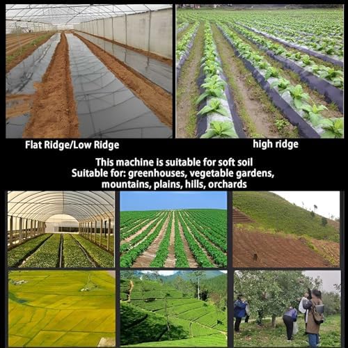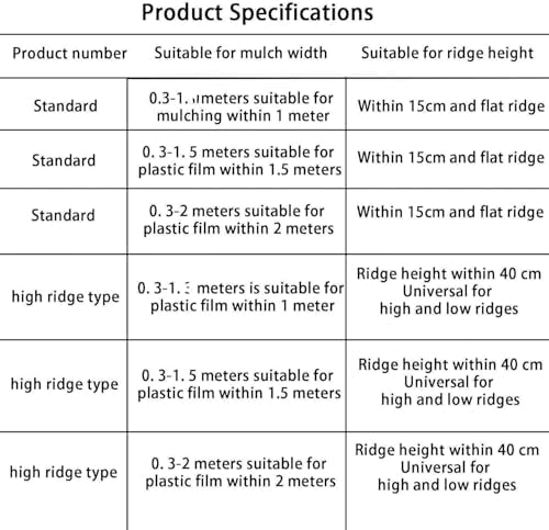 The Hand-Pulled Mulch Film Machine is an essential agricultural tool designed for use in greenhouses, vegetable gardens, hilly terrains, plains, and orchards. This versatile mulching machine is available in two models: a standard model and a high ridge adjustable model, both featuring various widths of plastic film for different applications. For the standard model, the ridge height accommodates up to 15 cm with the following specifications: - For widths of 0.3-1 m, it is compatible with film widths up to 1 meter. - For widths of 0.3-1.5 m, it is optimal for membranes and flat ground up to 1.5 m. - For widths of 0.3-2 m, it is well-suited for inner membranes and flat ground up to 2 m. The high ridge model allows for a ridge height of up to 40 cm, with compatibility as follows: - For widths of 0.3-1 m, it supports film widths up to 1 meter. - For widths of 0.3-1.5 m, it is ideal for membranes and flat ground up to 1.5 m. - For widths of 0.3-2 m, it effectively accommodates inner membranes and flat ground up to 2 m. It is recommended to choose a mulch film machine with a slightly larger width than your current needs to allow for future adjustments and ensure a tighter fit on the film. Please note that 20 kg mulch film and folded mulch film are not compatible with this machine.