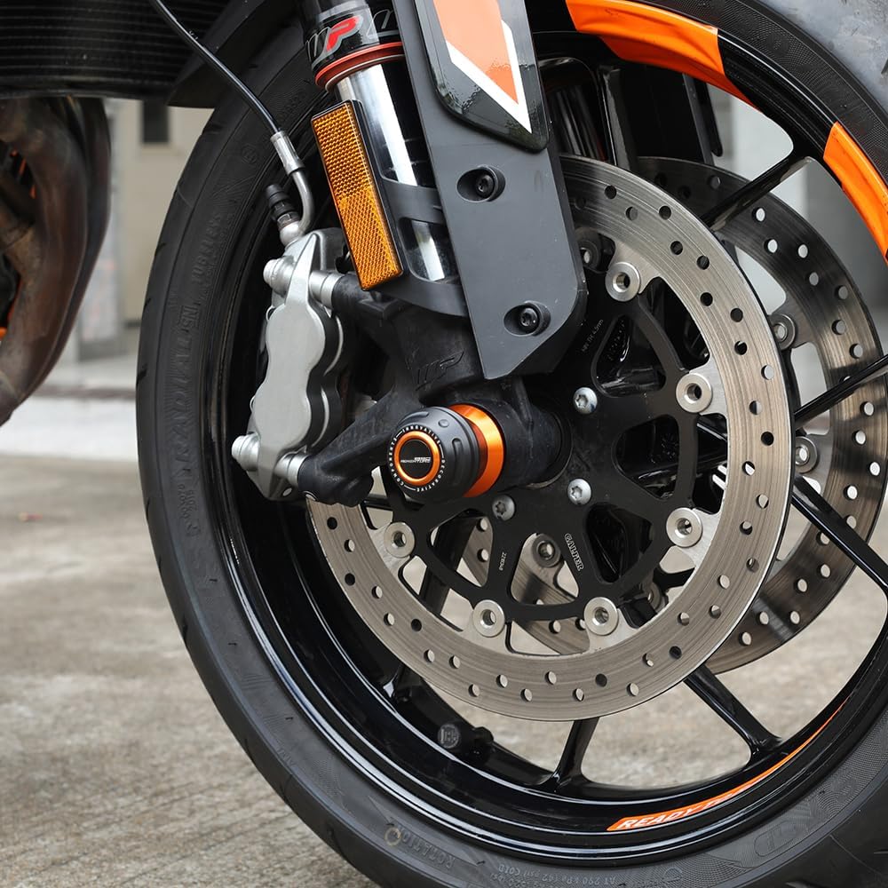 Features: ●●●Front Axle Sliders aid in reducing damage to the front forks, brake calipers and brake discs in the event of a crash by keeping these core components off the tarmac and out of harm's way! ●●●Each kit is tailored to each bike's specific axle length and diameter. ●●●The sliders are machined from the same High Density CNC Aluminum used in frame sliders. As the CNC Aluminum slider wears down in a slide/crash, its high friction qualities help reduce the bike's speed. Made in China Specification: Type: Motorbike Front Wheel Fork Sliders Protector Guard Pads Condition: Brand New, Never Mounted, Stable Quality. Material: CNC Aluminum 6061 Anodized + Phenol Formaldehyde Plastic (PF) Color: black/orange Quantity: 1 Installation: Easy to install. Fitment : Compatible with: ● 890 Adventure 2021 2022 2023 2024 ● 890 Adventure R 2021 2022 2023 2024 2025 ● 890 Adventure Rally 2021 2024 Note: Before ordering, make sure this part is compatible with your bike.