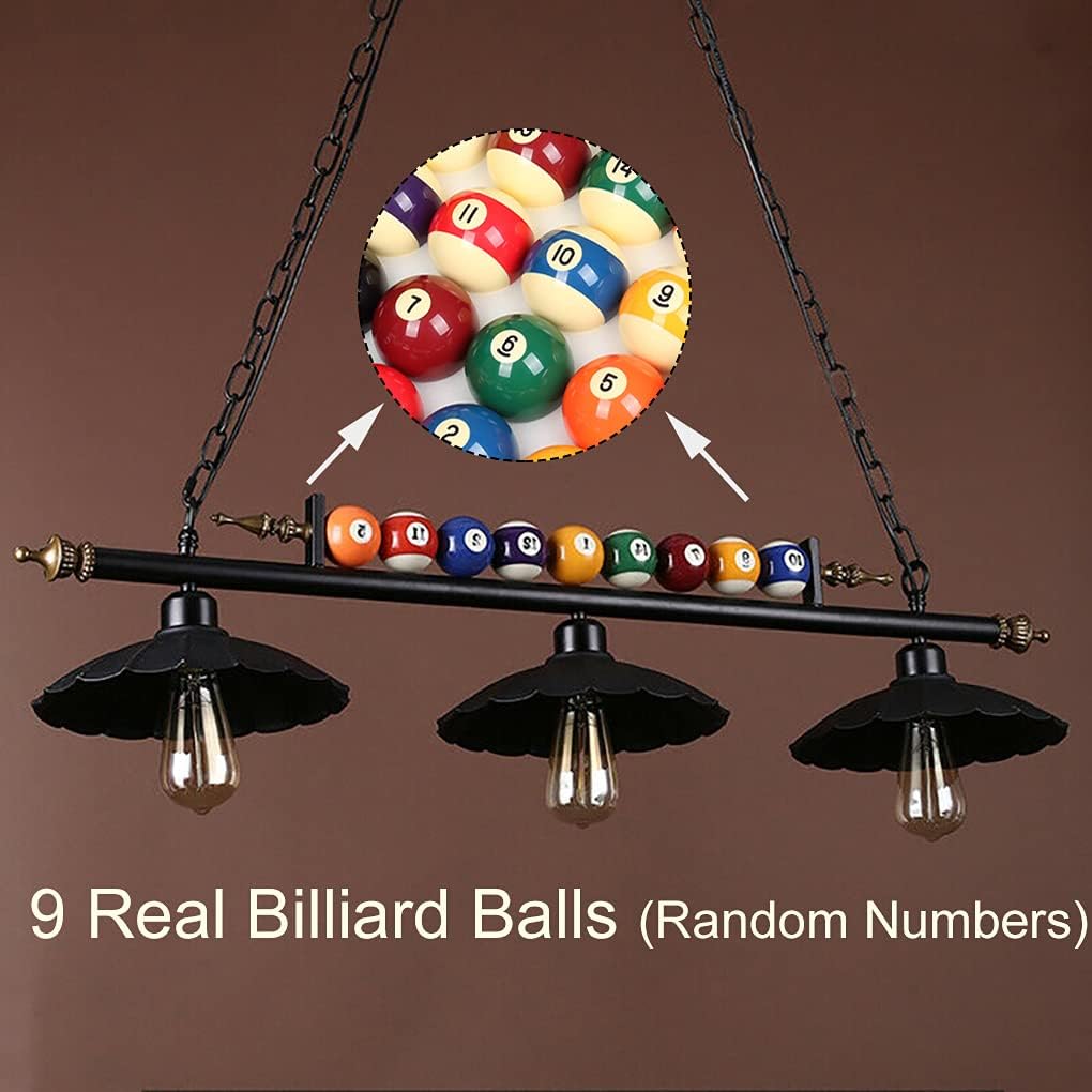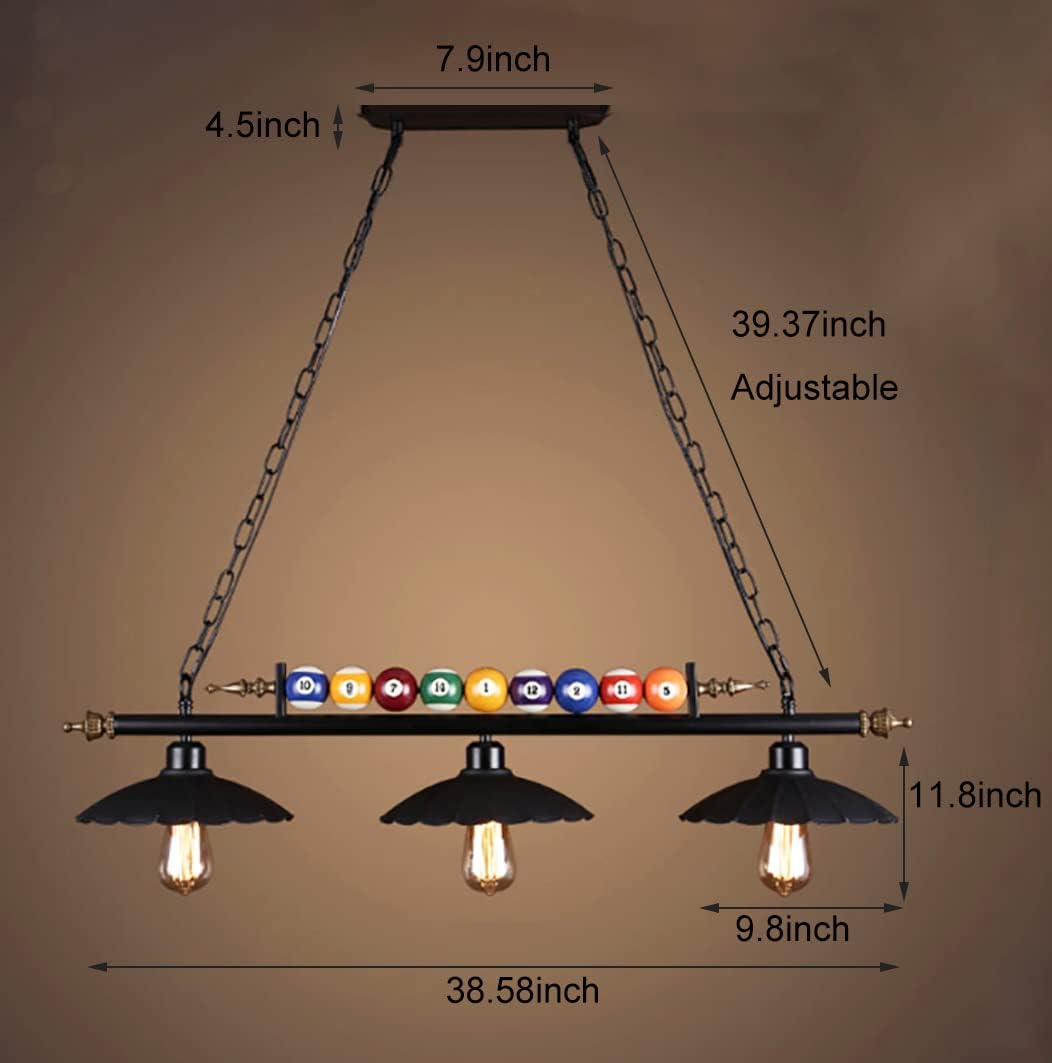 【Unique Design】Iron frame with 3 metal shades; Features 9 real billiard balls, Rustic color,black - creat various decoration styles-Farmhouse style / Rustic style /Loft Style/Vintage style/Retro style -will add a nice touch and create a sense of stylish look to your pool table and home interior.Perfect for billiard room,dining room,kitchen island,living room,foyer, cafe,bar, club【Illuminate Your Pool Table/Space】Features 3 Lights,support Max 60W per bulb ,will give off tremendous light ;Dimmable when used with compatible light bulbs dimmer switch combination【Sturdy and Durable】 Metal construction; High-strength & corrosion-resistance【Easy to Assemble & Install】Adjustable chain for easy installation;Assembly instructions and mounting hardware are included for quick and easy installation【Specification】Bulb Base: E26; Bulb Type: LED/Incandescent/Fluorescent/Halogen Bule; Number Of Lights: 3 Lights (not included); Wattage Per Bulb: 60W Max;Fixture Height: 11.81 inch (30 cm) ; Fixture Width: 38.58 inch (98 cm)【NOTICE】 BULB NOT INCLUDED; Please make sure you have cut off the electricity supply before installation; If you need further assistance , please contact us for help