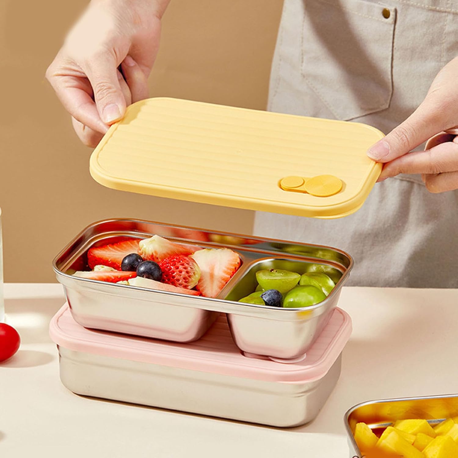 Stackable Bentos Container for Picnics and Camping Portable 304 Stainless Steel Food Box Silicone Seal Lunch Features Experience comfort with our portable camping picnics lunch box, designs for camping enthusiasts who appreciate the functionality and styles. This food grade 304 stainless steel and silicone lunch box ensures that safety and durability provides a strong seal to avoid spills and stackable designs for space-saving storage. Ideal for families and individuals who love outdoor camping, office workers and picnic lovers. Perfect for camping trips, picnics, gatherings outdoors, office lunches and school meals and this bento box effortlessly adapts to any environment not only a practical tool, but also a kitchen accessory. Specifications: Component: 304 stainless steel, silicone. Size: approx. 11 x 19 cm. Colour: green / yellow. Weight: 264 g. Quantity: 2 pieces. Package includes: 2 x lunch boxes. Note: 1. Please allow 1-2 cm error due to manual measurement, make sure you try hard before ordering. 2. Due to differences between different monitors, the picture may not reflect the actual colour.